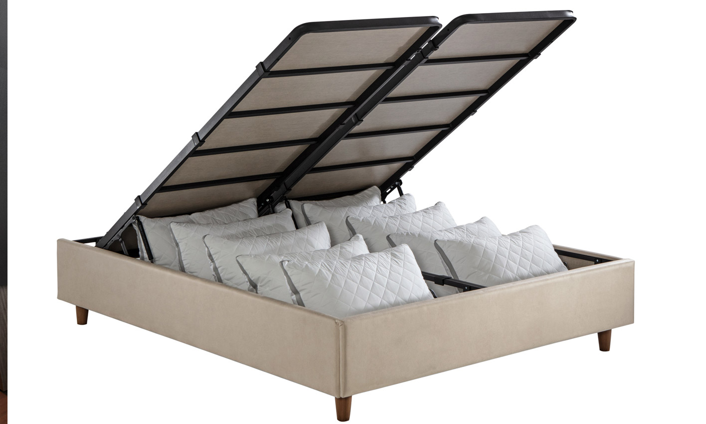 Sandıklı baza yapısı, yorgan, yastık ve mevsimlik eşyaları ortadan kaldırmadan düzenlemenizi sağlar. Kapakların açılıp kapanması günlük kullanımda sizi yormaz; pratik bir akış sunar. Eşyalarınızı saklarken yatağı her seferinde tamamen kaldırmak zorunda kalmazsınız.