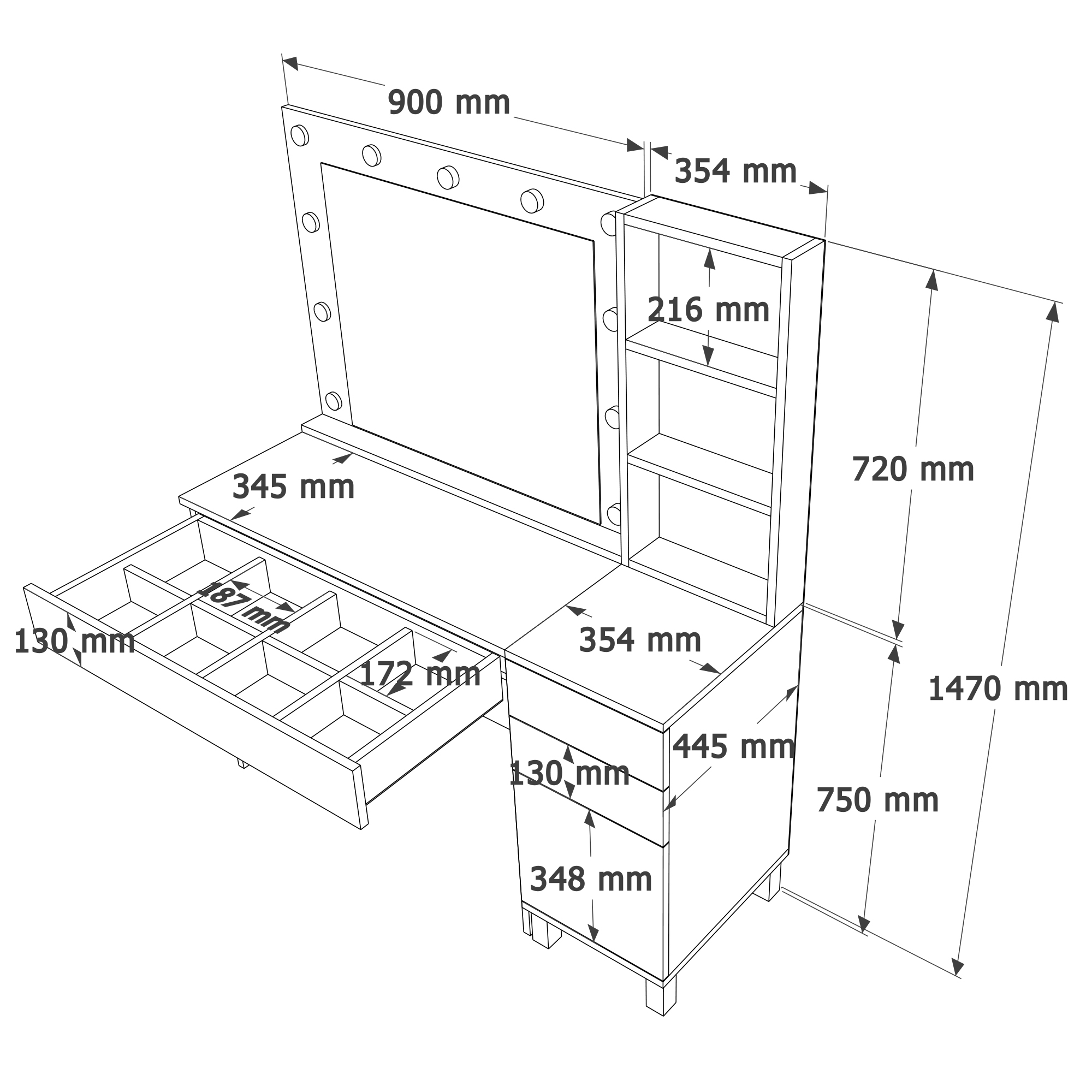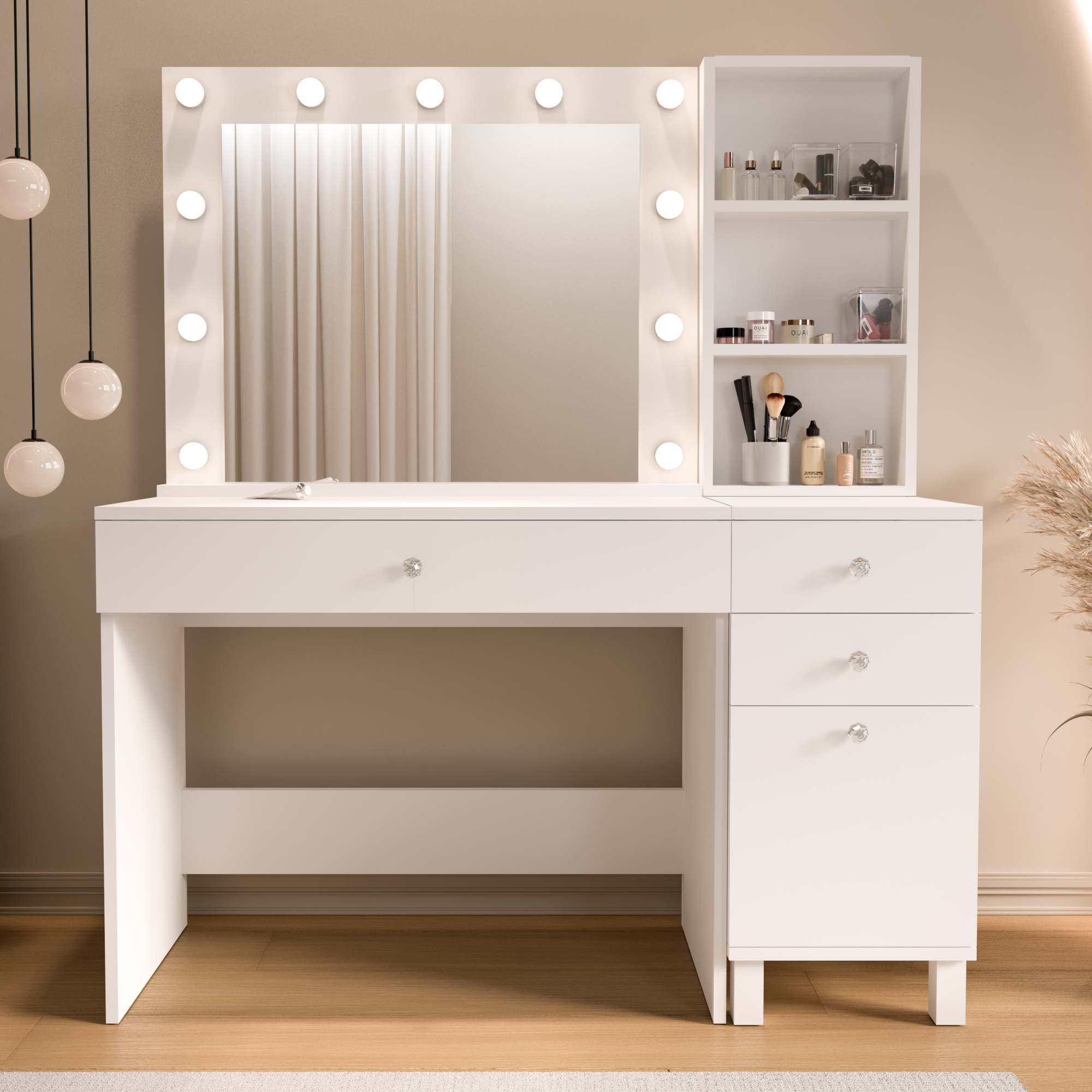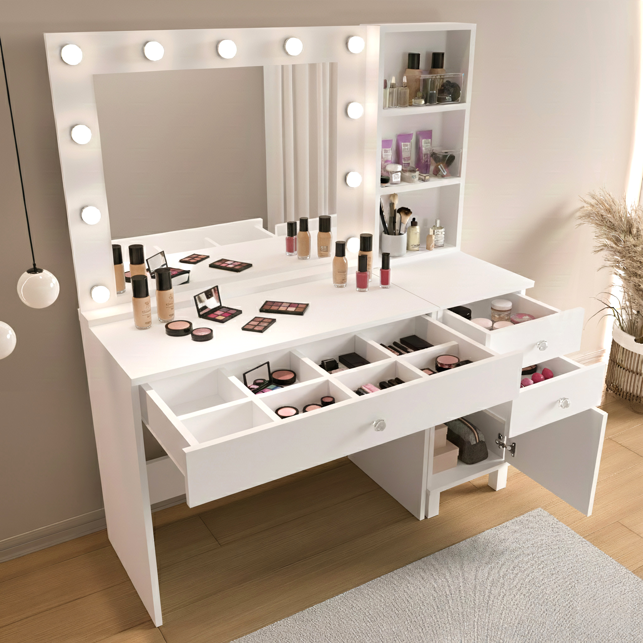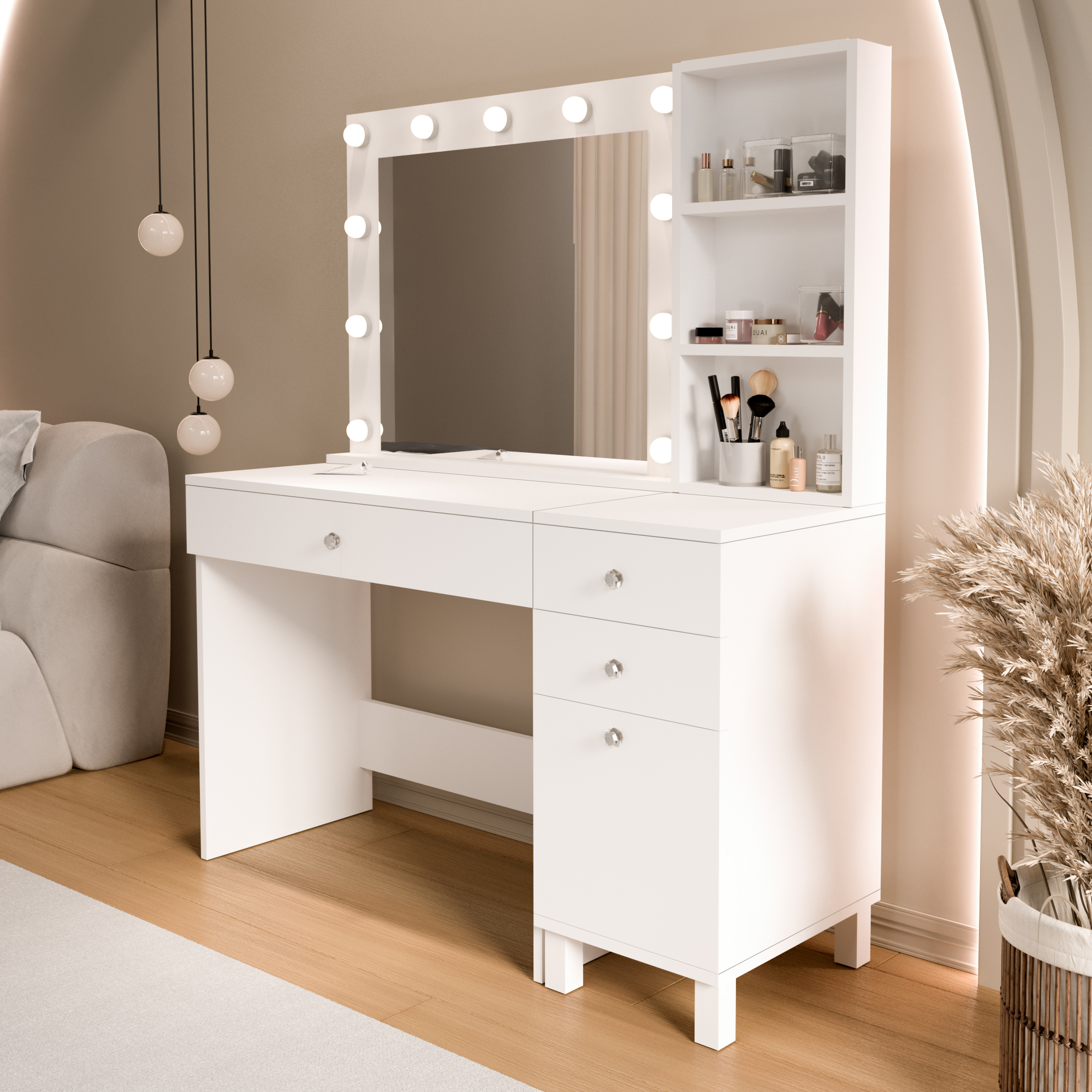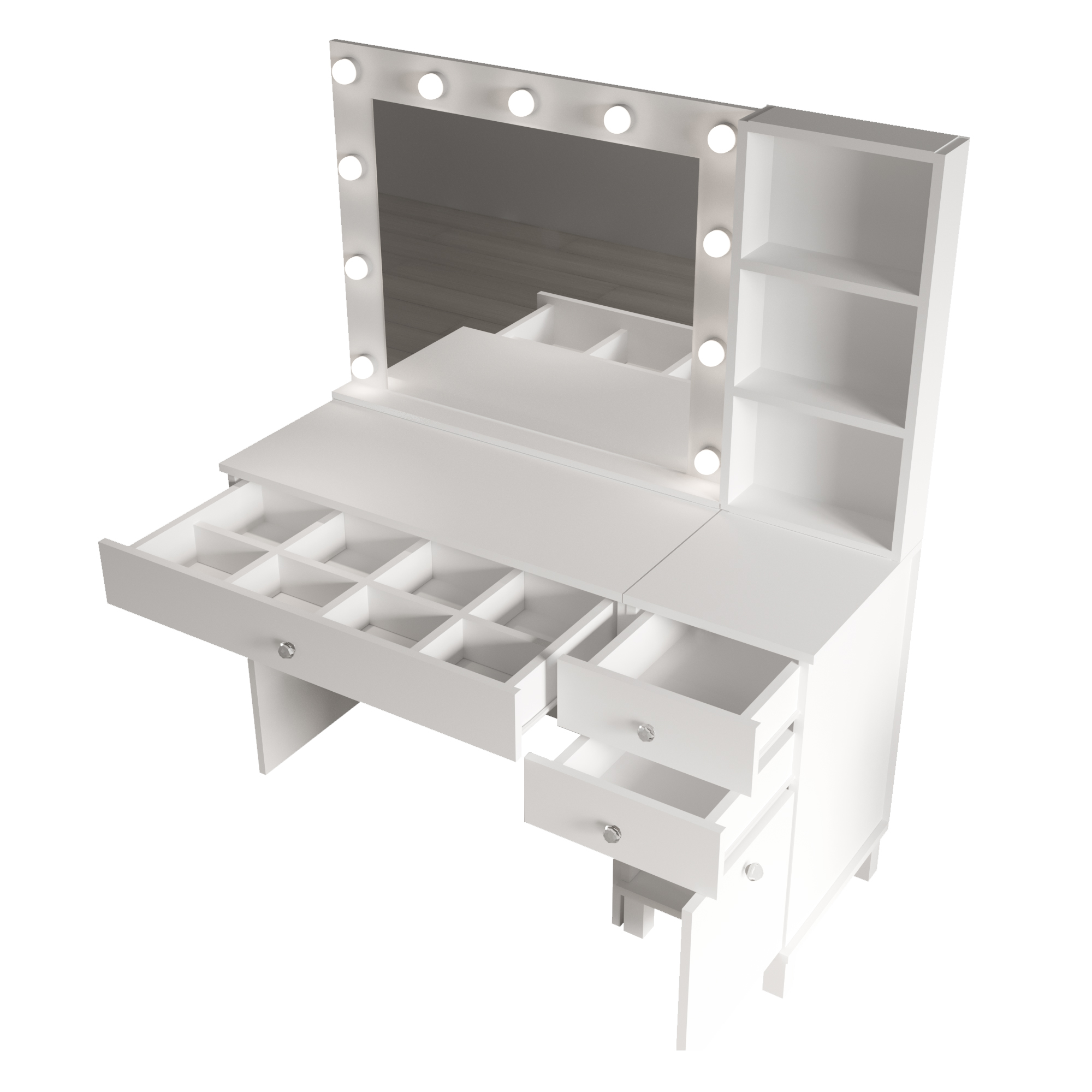 Monroe Makyaj Masası 3 Çekmecel Kapaklı Düzenleyici Hollywood Led Işıklı Raflı Beyaz MO6-W