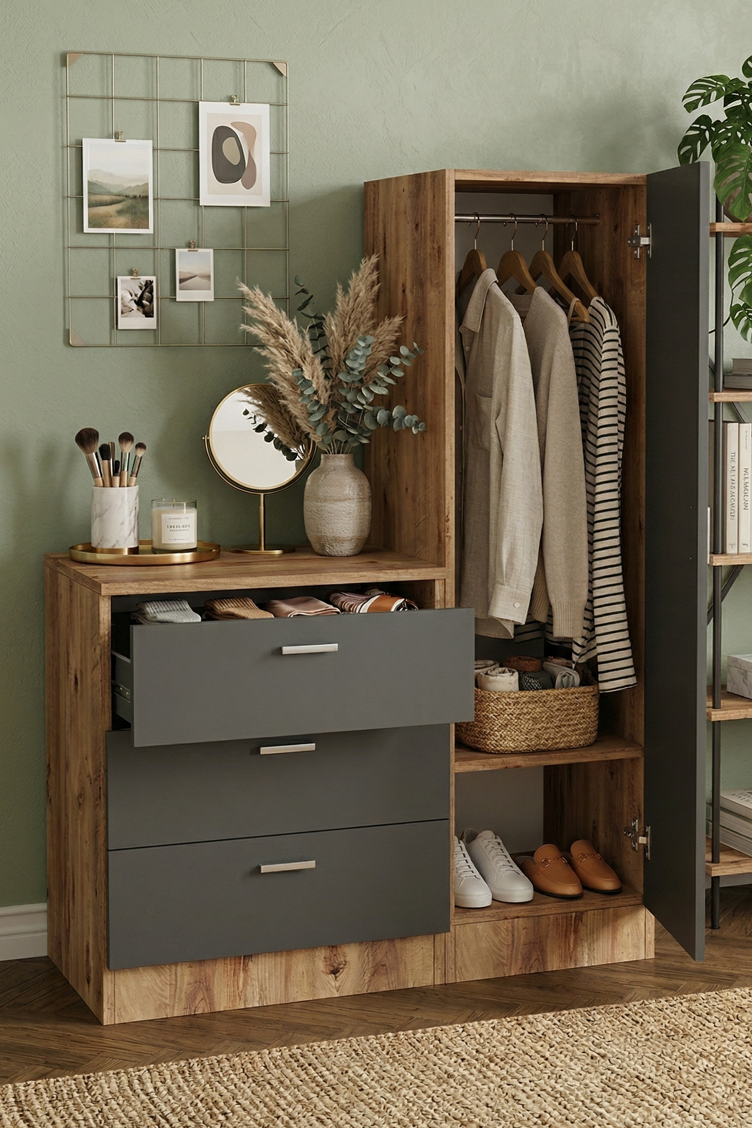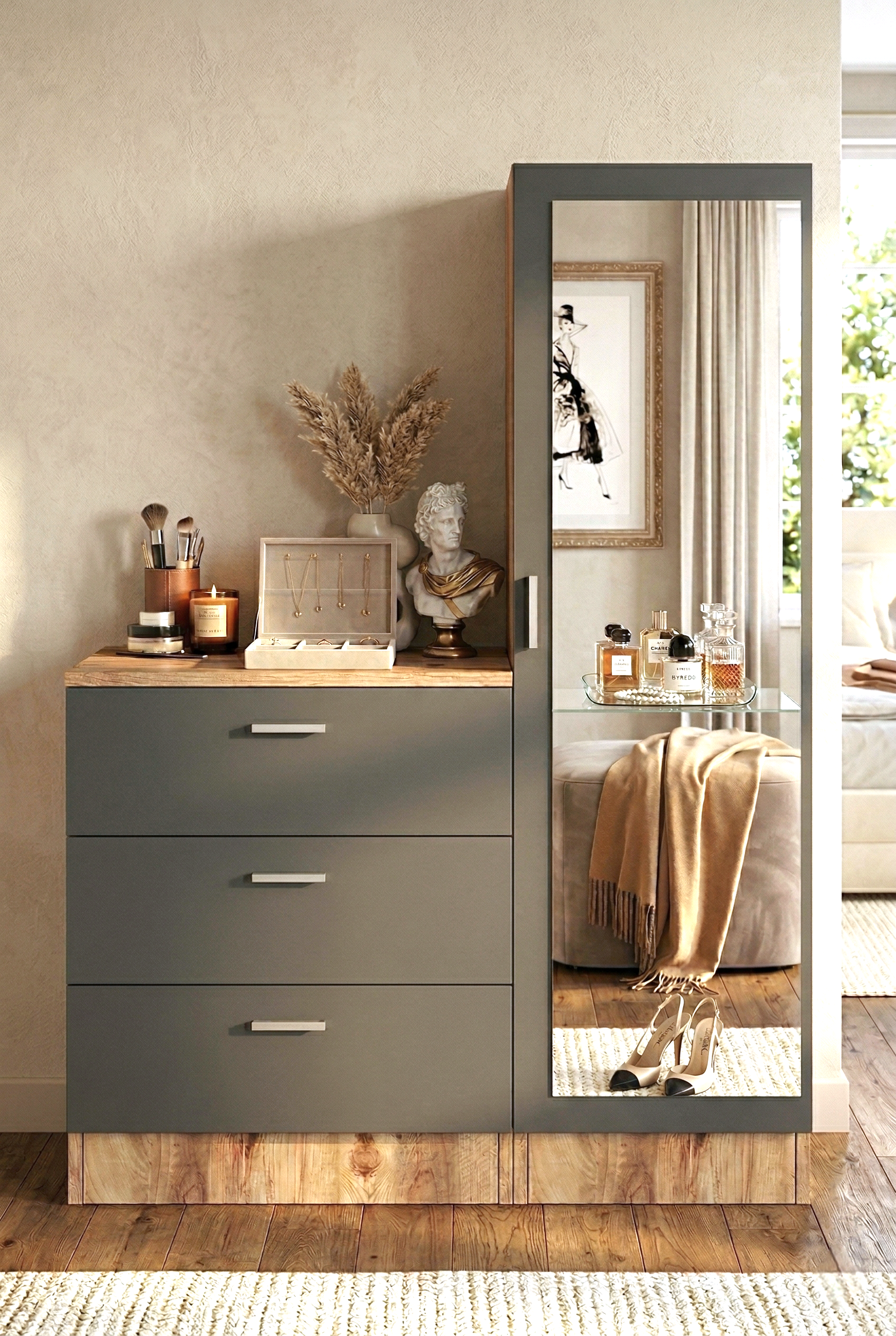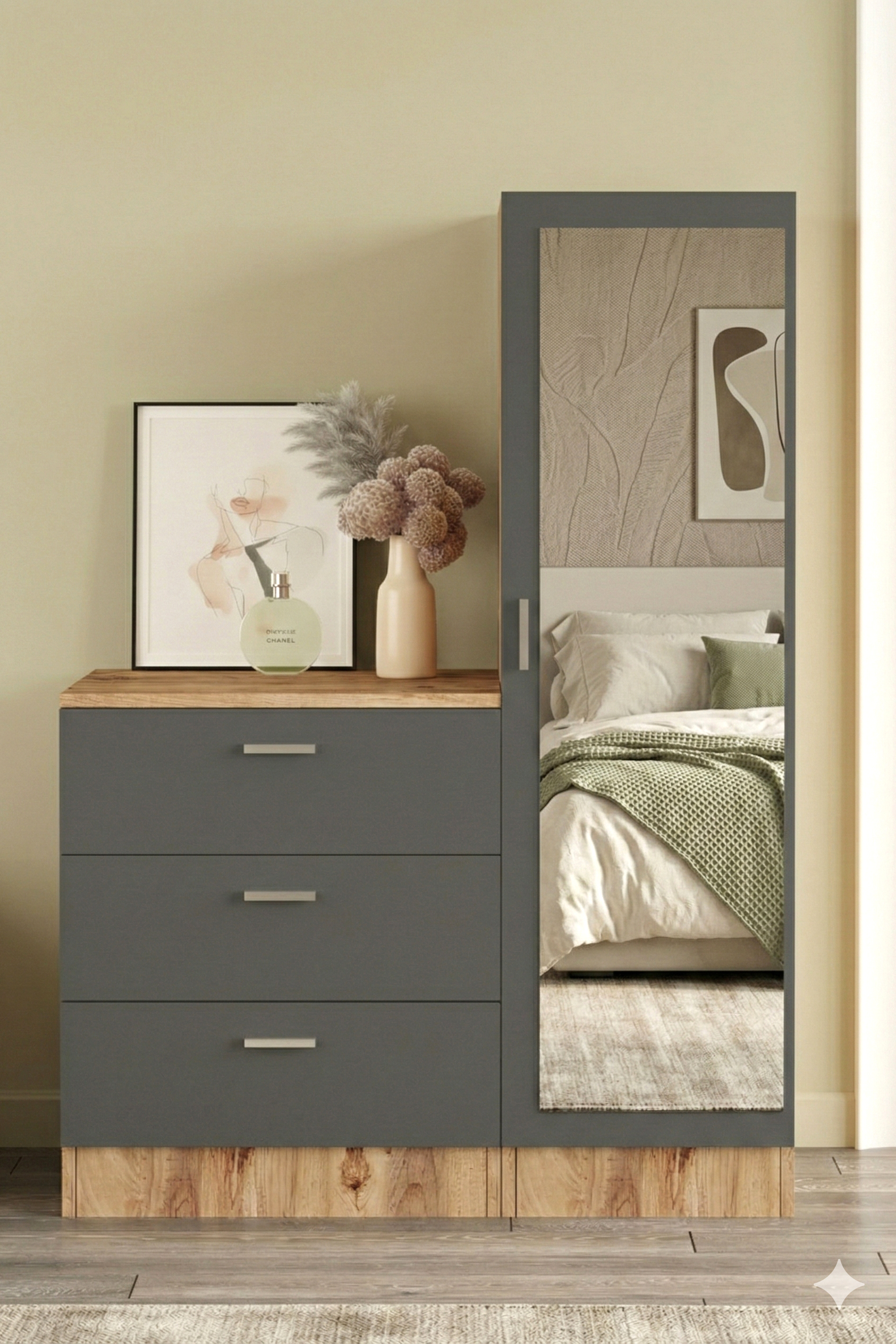 Nancy Aynalı Şifonyer Gardırop Çam-Antrasit