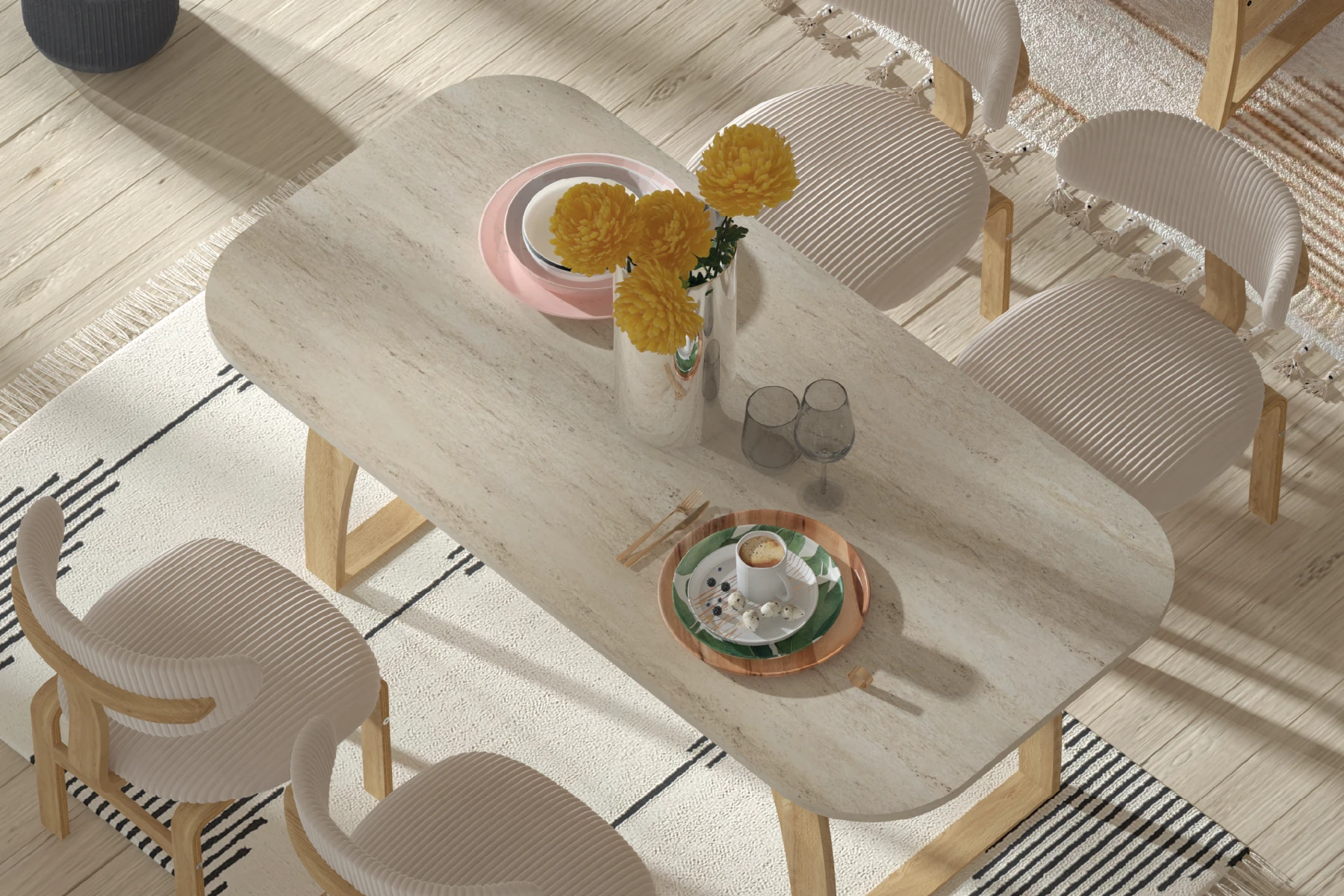 Sofya Sandalye Tiran Ahşap Mutfak Masası Takımı – 90×180 Cm Traverten/Kestane – 6 Adet