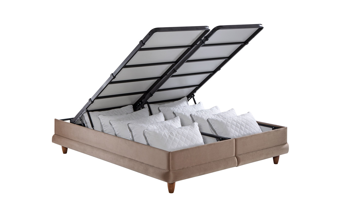 Sandıklı baza yapısı, yastık, yorgan ve mevsimlik eşyalar için kullanışlı bir depolama alanı sunar. Yaklaşık 24 cm derinliğe sahip iç hacim, yatak odasında ekstra depolama alanı kazandırır. Sandıklı baza tercih edenler için hem düzen hem de kullanım kolaylığı sağlayan bir yapı sunar.