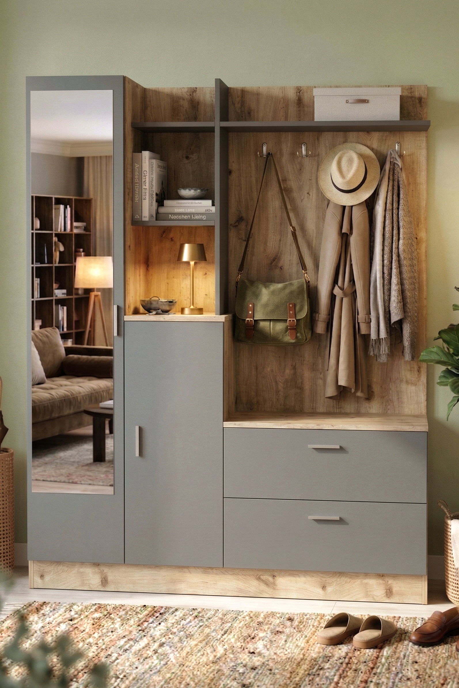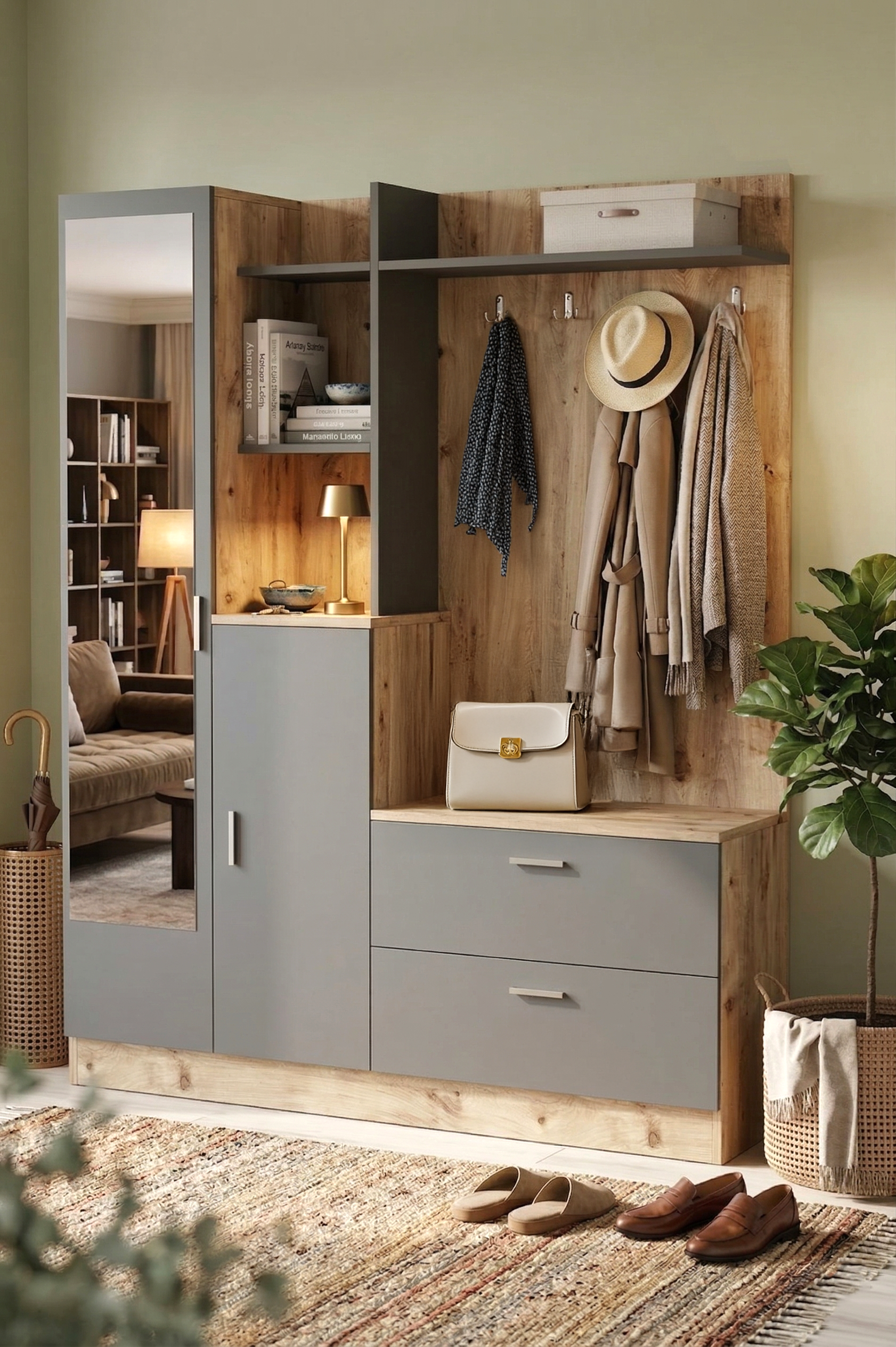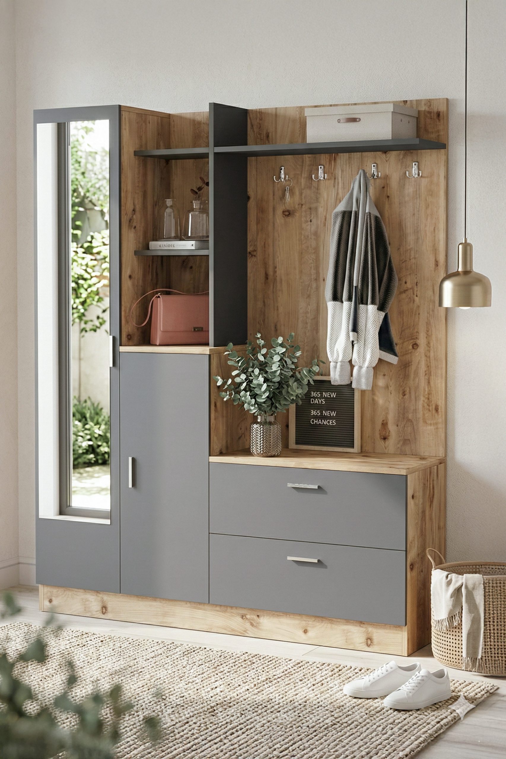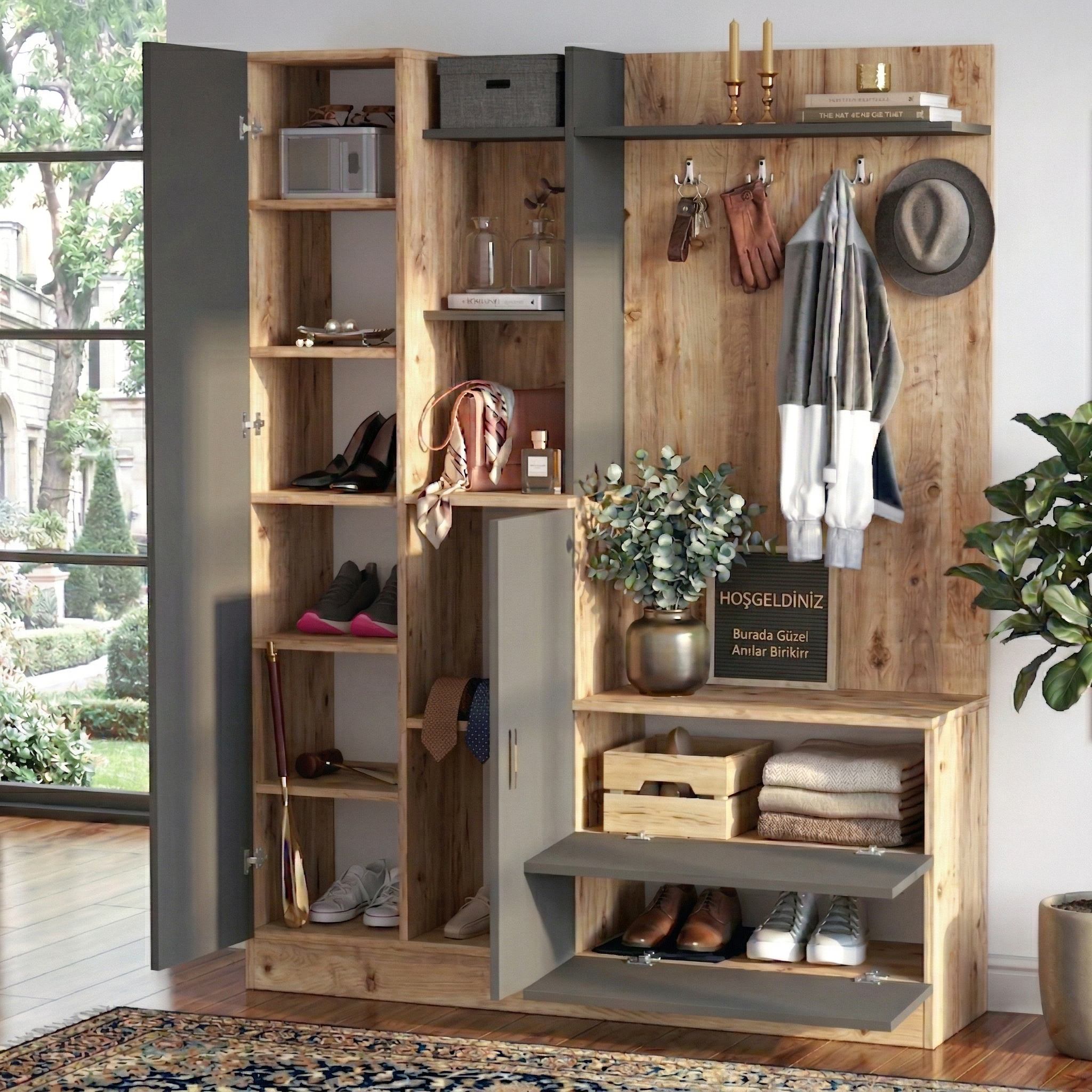 Wisdom Vestiyer Ayakkabılık Portmanto Aynalı Raf Çam-Antrasit